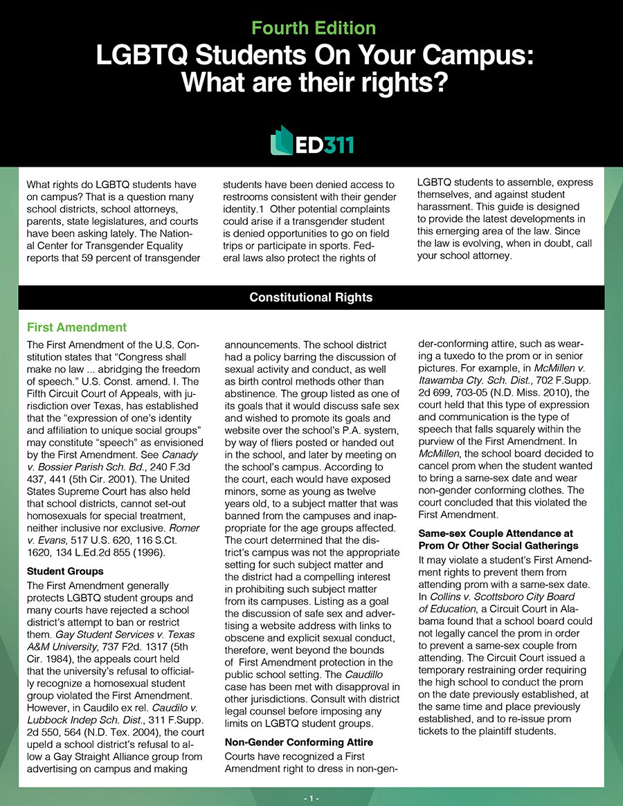 This 4th edition guide replaces the Transgender Students & Employees on Campus guide and is expanded to include laws applicable to all LGBTQ students. What rights do LGBTQ students have on campus? That is a question many school districts, school attorneys, parents, state legislatures, and courts have been asking lately. The National Center for Transgender Equality reports that 59 percent of transgender students have been denied access to restrooms consistent with their gender identity. Other potential complaints could arise if a transgender student is denied opportunities to go on field trips or participate in sports. Federal laws also protect the rights of LGBTQ students to assemble, express themselves, and against student harassment. This guide is designed to provide the latest developments in this emerging area of the law.